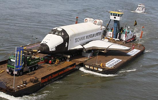 | 7日,一艘駁船運(yùn)載著前蘇聯(lián)“暴風(fēng)雪”號(hào)航天飛機(jī)行駛在德國(guó)西部韋瑟爾附近的萊茵河上。“暴風(fēng)雪”號(hào)無(wú)人駕駛航天飛機(jī)將在德國(guó)施派爾展出,它將是世界上第一艘向普通觀眾展出的航天飛機(jī)原型!氨╋L(fēng)雪”號(hào)于1988年11月15日發(fā)射升空,成功繞地球飛行兩圈后降落。新華社/路透 | |
