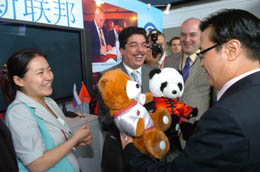 4月15日,一位俄羅斯商人在琶洲展館進口展區(qū)向中國客人贈送象征雙方友好的玩具禮物。