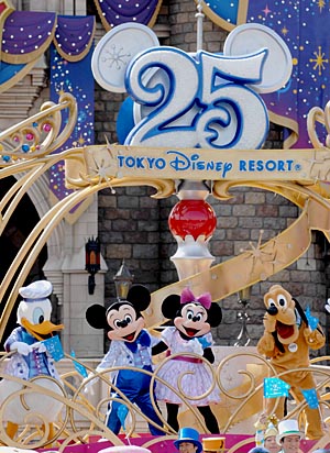 15日,在日本千葉縣的東京迪斯尼樂園,迪斯尼卡通“明星”在慶祝儀式上向游客致意。當天,東京迪斯尼樂園迎來25周歲生日。自1983年4月15日開園以來,東京迪斯尼樂園兩個主題公園累計接待游客數(shù)量已達到4.36億人次。