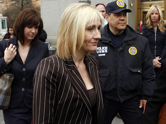 4月14日,在美國紐約,小說《哈利·波特》作者J·K·羅琳(前)向法庭陳述后離開。當(dāng)日,羅琳與一名美國“哈利·波特”迷對簿公堂。羅琳認(rèn)為,這名“粉絲”打算出版的《哈利·波特詞典》侵犯了她的知識產(chǎn)權(quán)。新華社/路透