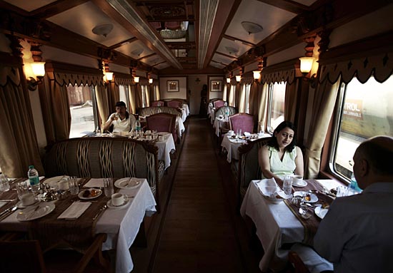 旅客在印度哈桑站停車的“金色戰(zhàn)車”號豪華列車的餐車?yán)锍燥?攝于4月10日)!敖鹕珣(zhàn)車”號是卡納塔克邦旅游發(fā)展公司為了促進(jìn)旅游業(yè)和鐵路部門聯(lián)合開發(fā)的高檔豪華列車。為了吸引商業(yè)旅行的客戶,“金色戰(zhàn)車”號上配有會議室和無線網(wǎng)絡(luò)服務(wù)。新華社/法新