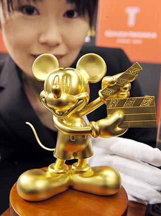 23日,在日本首都東京舉行的迪斯尼公司電影《國(guó)家寶藏2》DVD的推廣活動(dòng)上,工作人員展示一只純金米老鼠。這只米老鼠高12厘米,重一公斤,價(jià)值約3.2萬美元,將在迪斯尼公司DVD推廣活動(dòng)上作為獎(jiǎng)品發(fā)放。新華社/法新