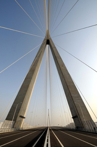 這是4月25日拍攝的蘇通大橋索塔。近日,已經(jīng)通過驗收的蘇通長江公路大橋正在為正式通車進行最后準(zhǔn)備。蘇通大橋連接江蘇南通與蘇州兩市,全長32.4公里,總投資約85億元,由跨江大橋工程和南、北岸接線工程三部分組成,大橋主跨1088米,為世界最大跨徑斜拉橋,創(chuàng)造了最深橋梁樁基礎(chǔ)、最高索塔、最大跨徑、最長斜拉索4項斜拉橋世界紀(jì)錄,其雄偉的身姿成為橫跨在長江之上的一道亮麗風(fēng)景。 |
