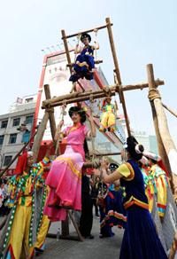 5月3日,來(lái)自云南怒江傈僳族自治州的傈僳族青年在昆明南屏街頭表演四人轉(zhuǎn)秋千。