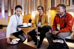5月4日,青島奧運村工作人員在為兩名奧地利運動員送咖啡。