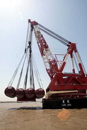 5月7日,上海振華港機(jī)集團(tuán)在上海長(zhǎng)興島基地舉行7500噸全回轉(zhuǎn)自航式浮吊吊重和落成儀式。浮吊一次起吊7500噸圓滿(mǎn)成功。新華社發(fā)