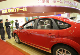5月15日,在北京春季房展會(huì)展廳,一家參展房地產(chǎn)公司展示“買(mǎi)房送車(chē)”的車(chē)型。當(dāng)日,2008年北京春季房展會(huì)在北京國(guó)貿(mào)中心開(kāi)幕,共有100多個(gè)房產(chǎn)項(xiàng)目參展。