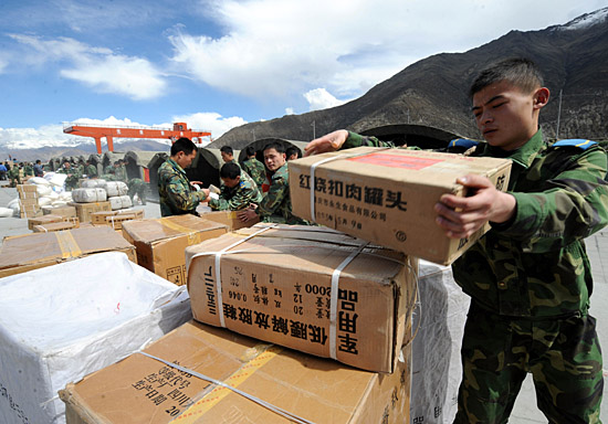 5月18日,解放軍戰(zhàn)士在拉薩搬運(yùn)救災(zāi)物資。當(dāng)日,西藏20多個(gè)單位向四川地震災(zāi)區(qū)捐贈(zèng)藏藥、食品、礦泉水等價(jià)值1100多萬元的物資。