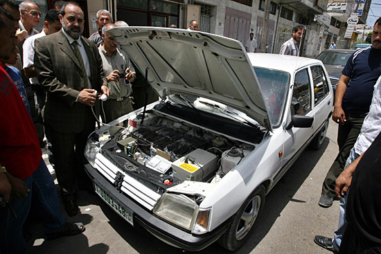 21日,在燃料緊缺的加沙地帶,人們圍觀一輛由法耶茲·安曼(前左)等當(dāng)?shù)仉姎夤こ處煿餐O(shè)計(jì)的電動(dòng)車。這輛車充電一次可以行駛200公里。