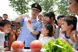 5月22日,淮北工商人員在淮北市濉溪縣四鋪鄉(xiāng)二鋪店小學(xué)為學(xué)生講解食品安全常識(shí)。當(dāng)日,安徽省淮北工商部門(mén)組織人員在鄉(xiāng)村學(xué)校開(kāi)展“食品安全進(jìn)鄉(xiāng)村學(xué)!被顒(dòng),為鄉(xiāng)村兒童講解食品識(shí)假以及維權(quán)常識(shí),受到師生們的歡迎。 |