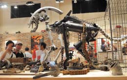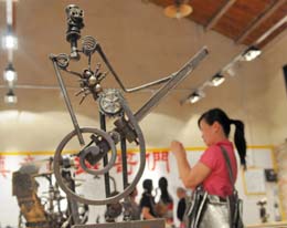 一場以“創(chuàng)意與環(huán)!睘橹黝}的環(huán)保鐵藝秀日前在浙江嘉興開展,參展作品主要由從廢品收購站“淘回”的廢舊零件打造而成,讓人耳目一新。圖為參觀者欣賞環(huán)保鐵藝作品。