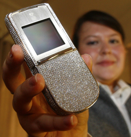 日前,在德國慕尼黑舉行的一個奢侈品展上,模特展示一個名為“星星天使”的手機。該手機表面用白金制造,并鑲嵌了1700顆天然鉆石,售價約為17.9萬歐元(約合27.6萬美元)。