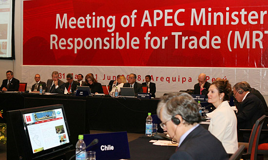 5月31日,第14屆亞太經(jīng)濟合作組織貿易部長會議在秘魯南部阿雷基帕省首府阿雷基帕開幕。亞太經(jīng)合組織21個經(jīng)濟體的貿易部長或其他高級官員以及世界貿易組織的代表共200多人出席了會議。由商務部部長陳德銘率領的中國代表團也出席了會議。新華社發(fā)