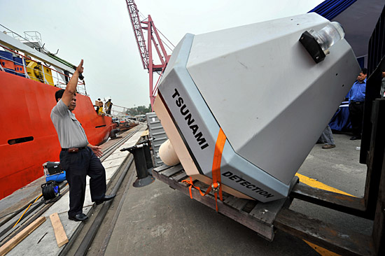 10日,在印度尼西亞首都雅加達,工作人員卸下一個海嘯預警浮標。美國國家海洋大氣管理局向印尼捐贈了兩座海嘯預警浮標,并將和印尼技術評估應用局一起將這兩個浮標安裝在巴厘島以南300公里的深海區(qū)域。這些浮標可以監(jiān)測海底地震,起到預報海嘯、減輕災害的作用。新華社/法新