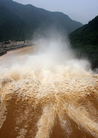 6月15日拍攝的湖南雙牌水庫開閘泄洪的場景。