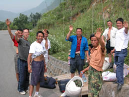 6月18日,地震災(zāi)區(qū)四川省青川縣竹園鎮(zhèn)幾位農(nóng)民準(zhǔn)備赴浙江打工。他們表示,青川受災(zāi)后全國人民給予了大力援助,但是他們不能長期等待救助,大家決心用自己勤勞的雙手,自力更生解決困難。