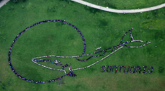 22日,人們?cè)谥抢锥际サ貋喐绲囊黄萜荷辖M成鯨魚的形狀和西班牙語“保護(hù)區(qū)”一詞的字樣。國(guó)際捕鯨委員會(huì)將于6月23日至27日在智利召開會(huì)議,再次就是否維持商業(yè)捕鯨禁令問題進(jìn)行討論。新華社/法新
