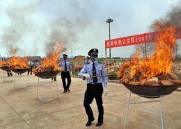 6月24日,幾位警察點(diǎn)燃將被銷毀的毒品。當(dāng)日,昆明鐵路公安局在“6·26”國(guó)際禁毒日前夕公開銷毀150余公斤毒品,包括海洛因、冰毒、鴉片、搖頭丸等。