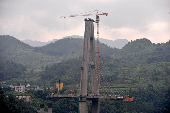 正在施工中的滬蓉西高速公路清江大橋(6月24日攝)。清江大橋位于湖北省恩施市舞陽(yáng)壩街道辦事處鴨子塘村,是滬蓉西高速公路西恩利段的控制性工程,也是滬蓉西高速公路西段最大的獨(dú)塔斜拉橋,主塔高166.5米,主跨220米,邊跨150米。目前該工程建設(shè)進(jìn)展順利。