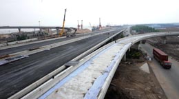 正在建設中的京津高速公路塘沽段(6月26日攝)。日前,迎奧運重點建設項目京津高速公路工程主線完工,有望于7月實現(xiàn)全線通車。京津高速公路3年前開工建設,北起北京朝陽區(qū)西直河,終點到達天津塘沽區(qū),全長184.4公里。