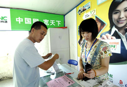 7月5日,在四川都江堰市幸福家園安置點,顧客在活動板房內(nèi)的網(wǎng)通應急營業(yè)廳辦理業(yè)務。搶通修復因災損毀的供水、道路、電力、通信等基礎(chǔ)設(shè)施,對抗震救災的順利開展至關(guān)重要,也是災后重建和恢復生產(chǎn)的重要前提。記者采訪了解到,目前四川地震災區(qū)水、電、路和通信等基礎(chǔ)設(shè)施基本恢復。