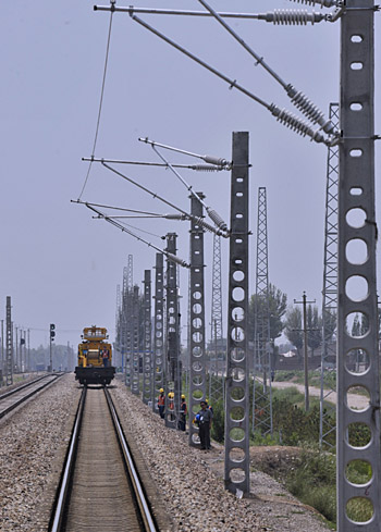 7月7日,中鐵電氣化局一公司的架線施工車輛在為改造的電氣化鐵路架線。當(dāng)日,我國北方運煤通道大包電氣化鐵路全面開展接觸網(wǎng)架設(shè)施工,標(biāo)志著這一重要工程進(jìn)入最后關(guān)鍵階段。大包電氣化鐵路為內(nèi)蒙古首條國有電氣化鐵路,起始于山西大同市,終至內(nèi)蒙古包頭市,全長450公里,是西北、華北、東北地區(qū)客貨運輸?shù)闹匾獦屑~。 | |