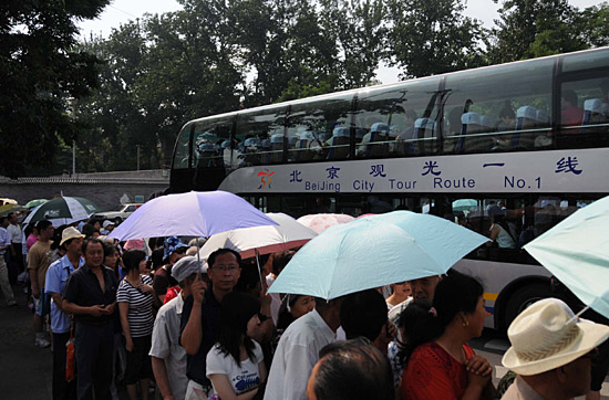 7月20日,乘客在觀光專線的北官廳站排起長隊等待乘車。當(dāng)日,北京開通兩條奧運觀光專線,供國內(nèi)外游客奧運期間游覽奧運場館和北京市內(nèi)的名勝景點。