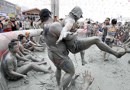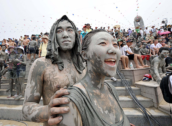 在韓國保寧大川海水浴場舉行的泥漿節(jié)上,游客們在泥漿中嬉戲。保寧每年舉行泥漿節(jié)吸引游客,游客可以將泥漿涂抹在身上美容護膚。新華社/法新