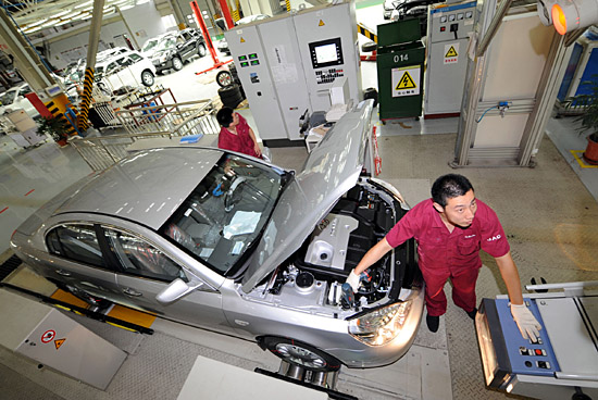 7月23日,兩名工人在江淮轎車生產(chǎn)基地總裝車間對(duì)一臺(tái)即將下線的賓悅轎車進(jìn)行檢測(cè)。據(jù)中國汽車工業(yè)協(xié)會(huì)統(tǒng)計(jì),今年上半年國產(chǎn)汽車產(chǎn)銷分別為519.96萬輛和518.22萬輛,同比分別增長(zhǎng)16.71%和18.52%。