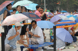7月24日中午,在北京奧林匹克中心區(qū)奧運(yùn)門票售票點(diǎn),市民們冒著酷暑排隊(duì)等候購買奧運(yùn)門票。