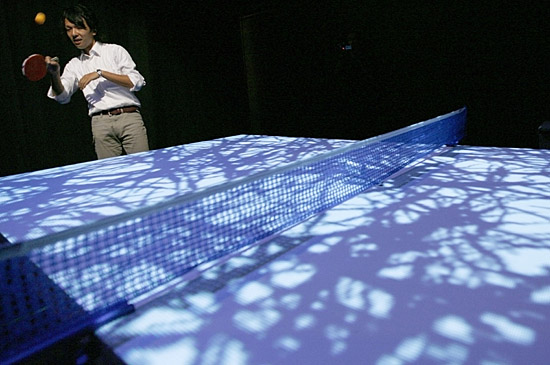 在日本橫濱市舉行的“橫濱Eizone”媒體預(yù)展上,一名男子體驗“數(shù)字乒乓”!皵(shù)字乒乓”是一個互動式藝術(shù)品,每當乒乓球觸及臺面,投射在臺面上的數(shù)字影像都會隨之改變。“橫濱Eizone”將向人們展示最先進的動畫、flash等數(shù)字信息技術(shù)。新華社/路透
