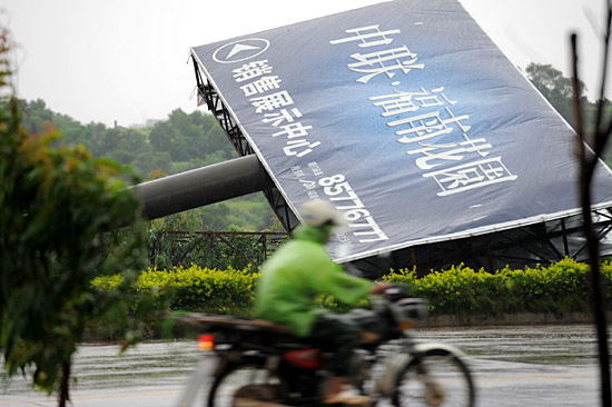 7月29日,福建省福清市一個巨型廣告牌被吹倒。國家防汛抗旱總指揮部29日統(tǒng)計顯示,受強臺風“鳳凰”帶來的強降雨影響,福建、浙江兩省目前已有33個縣357個鄉(xiāng)鎮(zhèn)153.55萬人受災,倒塌房屋261間,農田受災47.14千公頃,直接經濟損失9.23億元。