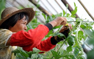 7月31日,廣西岑溪市馬路鎮(zhèn)馬路社區(qū)農(nóng)民羅富芬在“三避”技術(shù)示范基地給西瓜授粉。從2005年起,廣西先后投入1400萬元大力推廣“三避”(避雨、避寒、避曬)技術(shù),建成“三避”技術(shù)示范基地520多個(gè)、面積426萬畝,培訓(xùn)農(nóng)民360萬人次,并在試驗(yàn)與示范的基礎(chǔ)上,摸索出“三避”技術(shù)栽培模式30類,涉及瓜菜、水果、水稻等作物100多種。3年來,全區(qū)依靠“三避”技術(shù),實(shí)現(xiàn)新增農(nóng)業(yè)效益83億元。 |