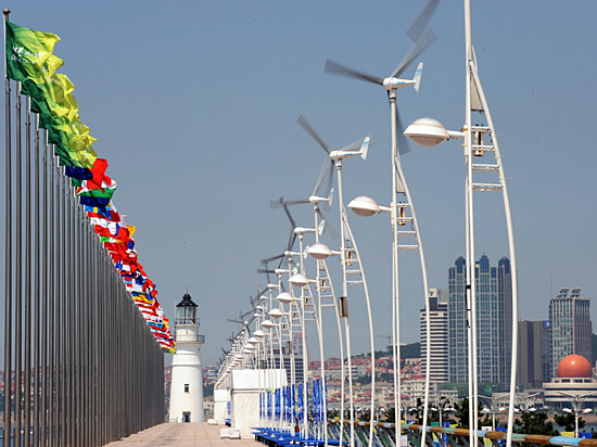 [進(jìn)入北京奧運(yùn)會(huì)專題] 奧帆中心主防波堤建設(shè)安裝了41盞風(fēng)能燈(8月3日攝)。 青島奧帆中心在場(chǎng)館建設(shè)中倡導(dǎo)“科技奧運(yùn)、綠色奧運(yùn)”的理念,大量利用太陽(yáng)能、風(fēng)能等清潔能源,成為集循環(huán)經(jīng)濟(jì)示范和新能源應(yīng)用等為一體的現(xiàn)代化賽場(chǎng)。 | |