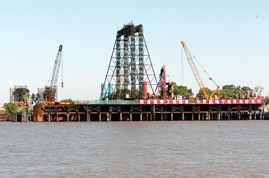 跨越哈爾濱市松花江兩岸的哈爾濱松浦大橋目前正在加緊建設(shè)。哈爾濱松浦大橋全長4.027公里,主橋為大跨度獨塔斜拉橋,主跨268米,邊跨208米,主塔高160米。這座大橋是哈爾濱市規(guī)劃的城市中心區(qū)重要越江通道之一,預(yù)計2010年建成通車。