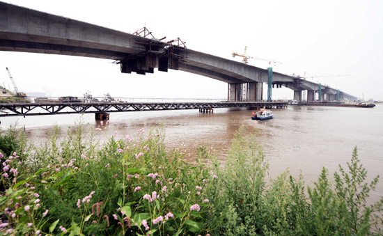 這是全線合龍的松花江大橋(8月7日攝)。近日,哈爾濱繞城公路東北段的松花江大橋全線合龍。松花江大橋是哈爾濱繞城公路的重要組成部分,該橋2005年5月開工建設(shè),全長2324.92米,總投資3.2億元,預(yù)計年內(nèi)可全部完工。該橋建成后,牡丹江等方向的車輛不必經(jīng)過哈爾濱市區(qū)就可直接開往長春等方向。