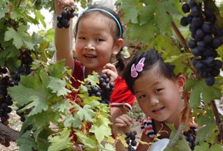 8月10日,兩名兒童在葡萄園里采摘葡萄。當日,山東平陰縣首屆圣母山葡萄采摘節(jié)在畢海洋村拉開序幕。本次采摘節(jié)舉行了吃葡萄比賽、采摘葡萄、交流葡萄種植信息等活動,吸引了周邊村民和濟南市民前來參加。