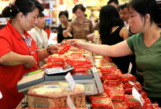 8月26日,顧客在上海第一食品商店內(nèi)選購簡(jiǎn)裝月餅。