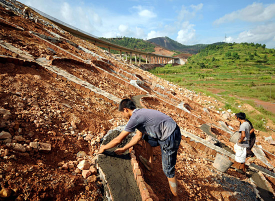 8月27日,建筑工人在修建岑溪至興業(yè)高速公路路基加固墻。未來(lái)5年,廣西將投資超過(guò)1200億元建設(shè)一批連通周邊國(guó)家和鄰省的高速公路。項(xiàng)目建成后,從南寧到長(zhǎng)沙只需9小時(shí),到昆明只需8小時(shí),到廣州僅需6個(gè)小時(shí)。