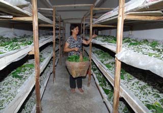 江西萬(wàn)年大力發(fā)展蠶桑產(chǎn)業(yè)。目前全縣桑園面積已發(fā)展到9000畝,養(yǎng)蠶農(nóng)戶達(dá)7000多戶,并全部實(shí)現(xiàn)手持訂單生產(chǎn)。8月30日,上坊鄉(xiāng)港邊村技術(shù)工人郝國(guó)珍在喂養(yǎng)桑蠶。新華社發(fā)(周科