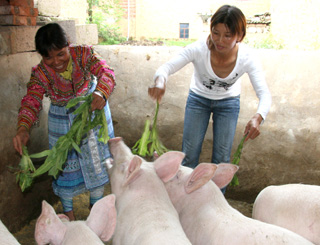 云南開(kāi)遠(yuǎn)養(yǎng)豬戶母豬領(lǐng)“補(bǔ)貼”。圖為樹(shù)木克上寨村彝族養(yǎng)豬戶周華清(右1)在給喂食快出欄的架子豬在政府補(bǔ)助下,她家養(yǎng)豬年獲益4萬(wàn)多元。新華社記者