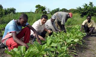 9月6日,在塞內(nèi)加爾首都達(dá)喀爾遠(yuǎn)郊的中國(guó)蔬菜種植示范園,農(nóng)藝專家盧永剛(左二)指導(dǎo)當(dāng)?shù)剞r(nóng)民蔬菜種植技術(shù)。從2005年開始,十多名來(lái)自中國(guó)的農(nóng)業(yè)技術(shù)專家在西非之角的達(dá)喀爾遠(yuǎn)郊設(shè)立一片占地1.3公頃的中國(guó)蔬菜種植示范園。經(jīng)過(guò)2年多耕耘,示范園已經(jīng)成功培育蔬菜30余種,培訓(xùn)當(dāng)?shù)剞r(nóng)業(yè)技術(shù)人員3190余人。 |