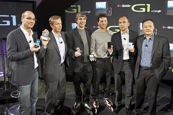 | 23日,在美國紐約,來自谷歌、德國電信和旗下移動服務(wù)提供商T-Mobile以及生產(chǎn)商臺灣宏達(dá)電的高層人員一同展示首款谷歌Android操作系統(tǒng)智能手機(jī)T-Mobile