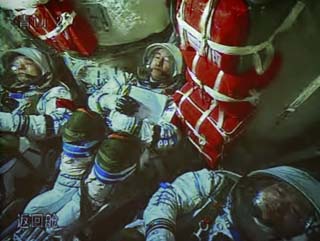三位宇航員在起飛后的神舟七號載人飛船上。新華社記者:查春明