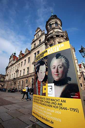 10日,《金龍與白鷹》中德宮廷藏品展的宣傳海報(bào)豎立在德國(guó)東部城市德累斯頓王宮前。當(dāng)天,《金龍與白鷹》中德宮廷藏品展向媒體開放,本次展覽為期3個(gè)月,是今年德累斯頓“中國(guó)年”的壓軸節(jié)目。展覽展出了中國(guó)清朝皇宮和德國(guó)薩克森選帝侯王宮收藏的繪畫和工藝珍品約400件,由德國(guó)德累斯頓國(guó)家藝術(shù)館和中國(guó)故宮博物院共同主辦。雙方提供的展品包括繪畫、瓷器、宮廷家具等,以相互比較的方式同室展出。
