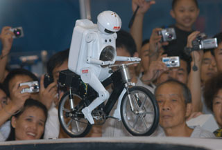 10月12日,在深圳舉辦的第十屆中國國際高新技術(shù)成果交易會上,機(jī)器人表演騎自行車通過呈“S”形狀的木板。這個由日本參展商帶來的騎車機(jī)器人裝有超聲波傳感器、陀螺儀傳感器和震動傳感器,感知到的信息可從傳感器傳到電腦,由電腦通過信息處理和傳輸來控制機(jī)器人騎車的速度和方向等。