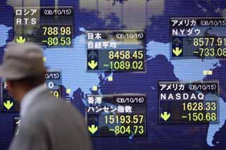 10月16日,行人從日本東京一塊日經(jīng)股指顯示板前走過。受歐美股市大跌和投資者擔(dān)心世界經(jīng)濟(jì)形勢惡化等因素影響,當(dāng)天東京股市日經(jīng)225種股票平均價格指數(shù)比前一個交易日下跌1089.02點(diǎn),收于8458.45點(diǎn),跌幅為11.41%。