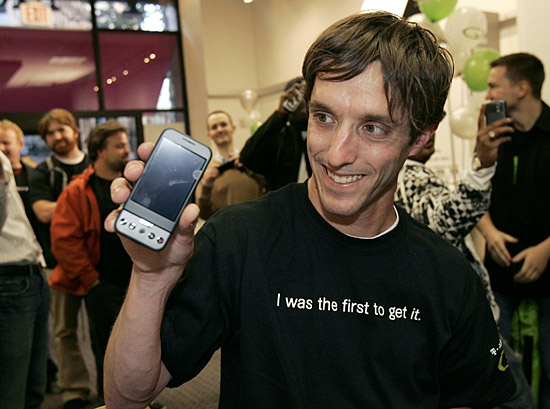 21日,在美國加利福尼亞州舊金山的T-Mobile手機(jī)店,萊迪士展示他剛剛買到的谷歌T-Mobile G1手機(jī)。他是這里第一個(gè)買到這款新上市手機(jī)的人。采用谷歌開發(fā)的Android系統(tǒng),由中國臺(tái)灣宏達(dá)公司生產(chǎn)的谷歌手機(jī)由T-Mobile公司進(jìn)行銷售。新華社/路透