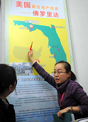 10月30日,一名工作人員在向購(gòu)房者介紹位于美國(guó)佛羅里達(dá)的房產(chǎn)項(xiàng)目。 當(dāng)日,2008北京秋季房地產(chǎn)展示交易會(huì)在中國(guó)國(guó)際貿(mào)易中心開(kāi)幕。此次房展匯集了北京、外埠近百個(gè)地產(chǎn)項(xiàng)目,來(lái)自澳洲和美國(guó)的國(guó)外地產(chǎn)項(xiàng)目也參加了展會(huì)。 | |