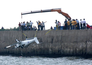 11月5日,打撈人員將墜海飛機吊上岸。